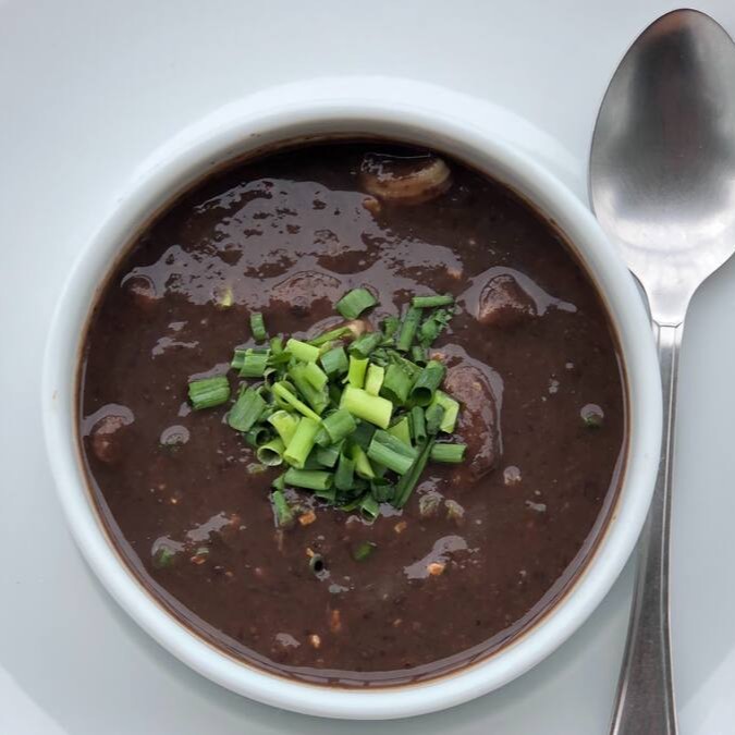 Caldo de legumes batido com feijão e macarrão penne