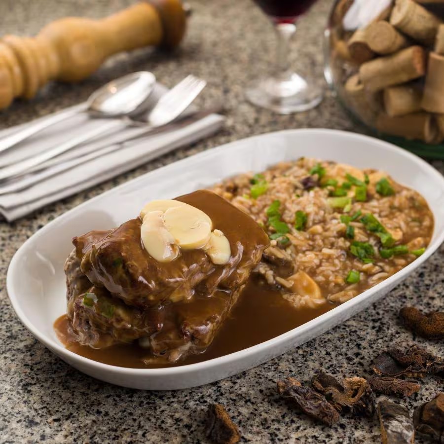 Mignon recoberto de molho madeira. Acompanha risoto indiano com shitake.