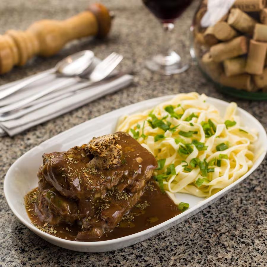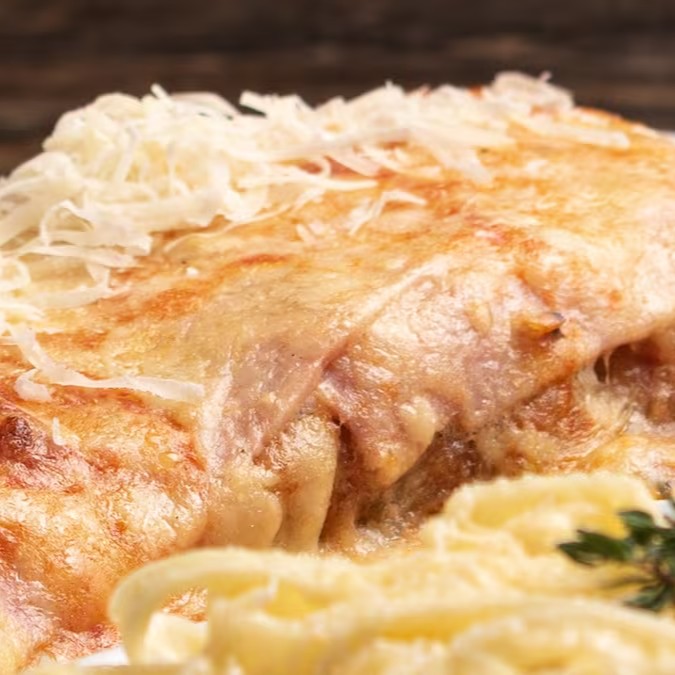 Mignon coberto com queijo e presunto e molho ao sugo, gratinado. Acompanha talharim na manteiga.