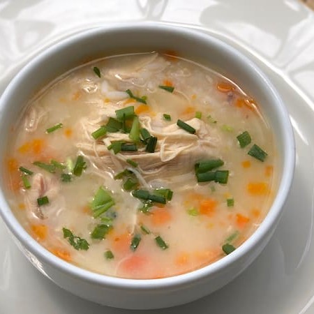 Caldo de frango com arroz, cenouras e frango