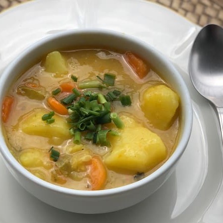 Caldo de legumes com pedaços de cenoura, batata inglesa, batata doce, cenoura e chuchu.