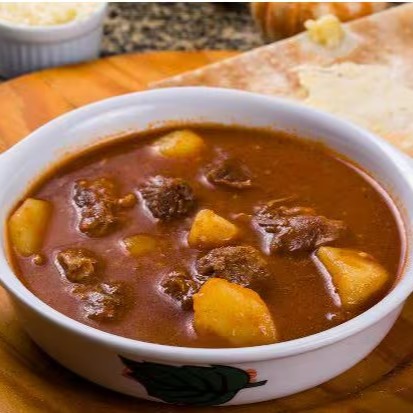 Caldo de carne com batatas e pedaços de carne