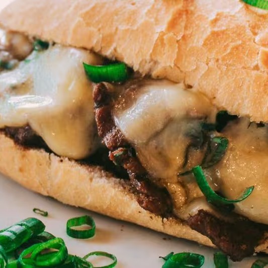 Pão francês, pedaços de carne feitos na parrilla, temperados a moda da casa, queijo muçarela e cheiro verde.