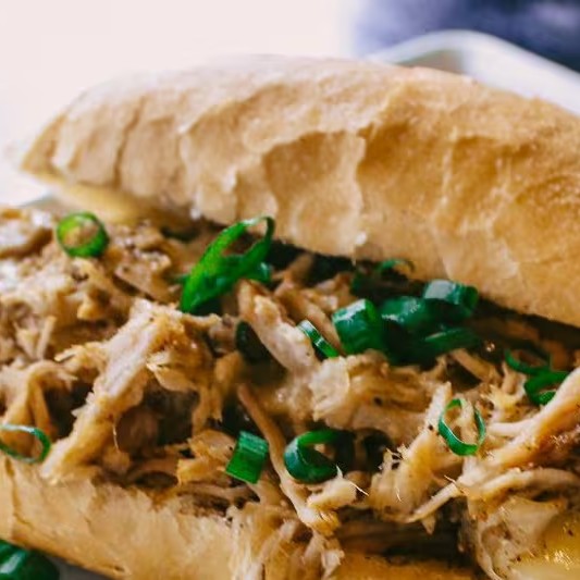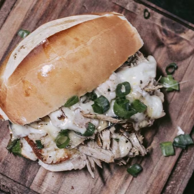 Delicioso sanduíche no pão francês, recheado com pernil desfiado, queijo muçarela e cheiro verde.