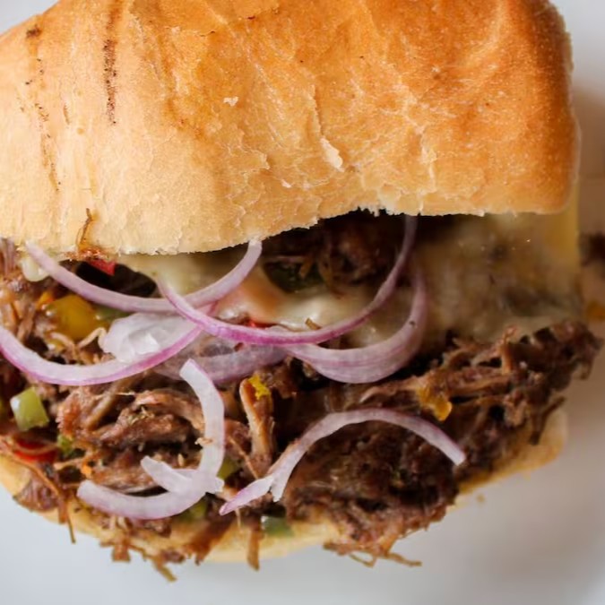 Pão francês, carne desfiada com tempero a moda da casa, cebola, queijo mussarela e cheio verde.