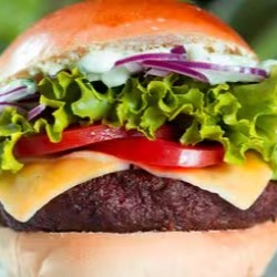 Pão, cebola roxa, alface, tomate, ketchup, mostarda e hambúrguer de proteína de soja ou brócolis ou couve flor.