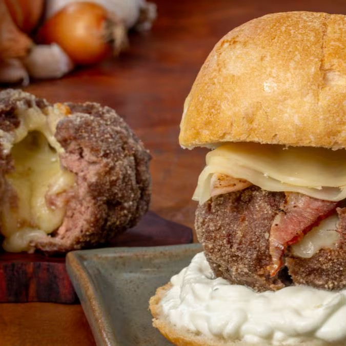 Pão francês, bolinho de costela recheado com queijo mussarela, alface americana, molho de alho e queijo mussarela.
