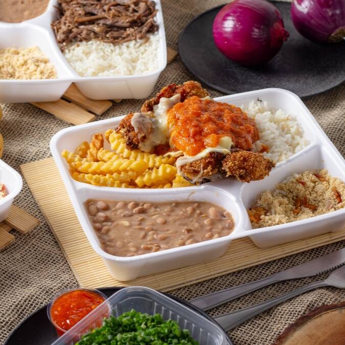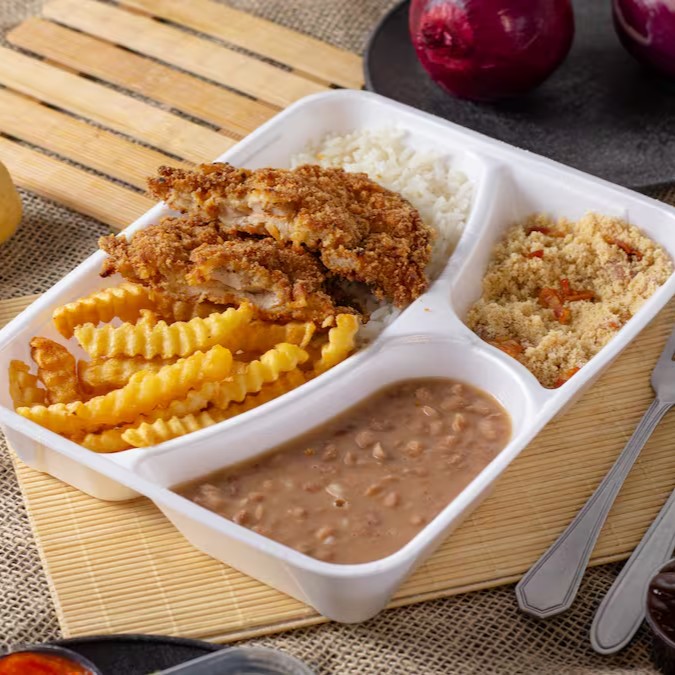 O 'Frango Empanado', um clássico das Comidas do Dia a Dia, é inigualável em sua deliciosa simplicidade. Este prato de 750g é composto por arroz branco macio e saboroso, feijão preparado à perfeição, batatas fritas crocantes e douradas, e uma farofa irresistível. Como estrela do prato, temos o frango (coxa e sobrecoxa) empanado, exibindo uma casquinha super crocante que dá lugar a uma carne interna incrivelmente suculenta. Esta combinação de sabores e texturas promete uma experiência gastronômica aconchegante e memorável.