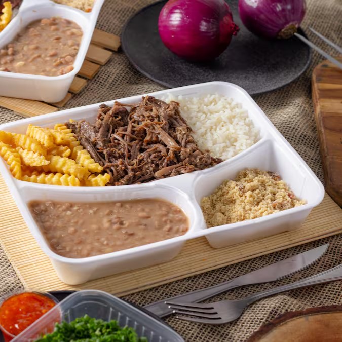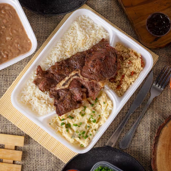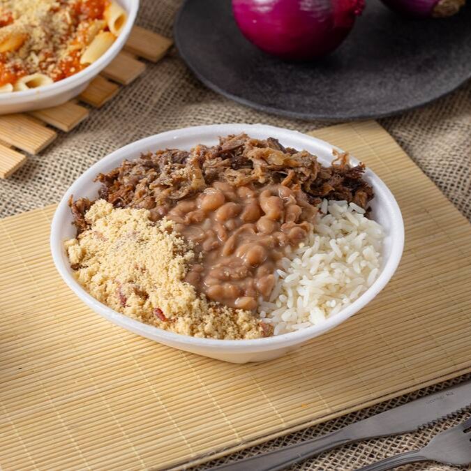Arroz soltinho, feijão bem temperado, batata frita, 200g de costela bovina desfiada desmachando e farofa c/ bacon da casa