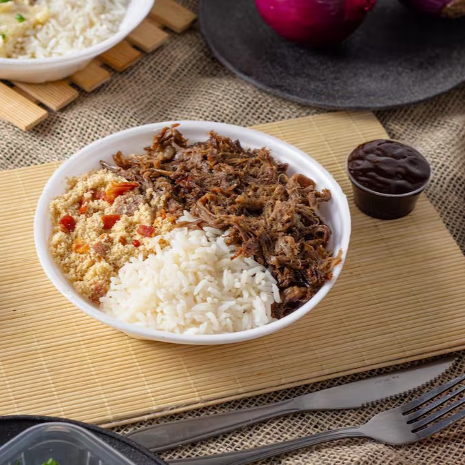 80 gramas de costela bovina desfiada, Arroz, Farofa de bacon feita na casa acompanhado de barbecue no potinho de 30g