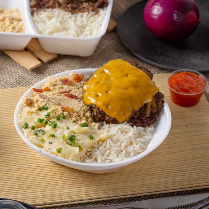Duplo smash de 70g cada esmagados na chapa + queijo cheddar fatiado Polenghi, arroz soltinho, batatone, farofa de bacon feita na casa