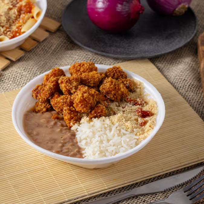 80g de Isca de frango empanada, acompanha: arroz soltinho, feijão temperadinho, farofa com bacon feita na casa