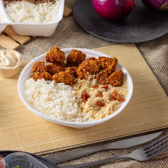 80g de Isca de frango empanada, Arroz, Farofa de bacon feita na casa