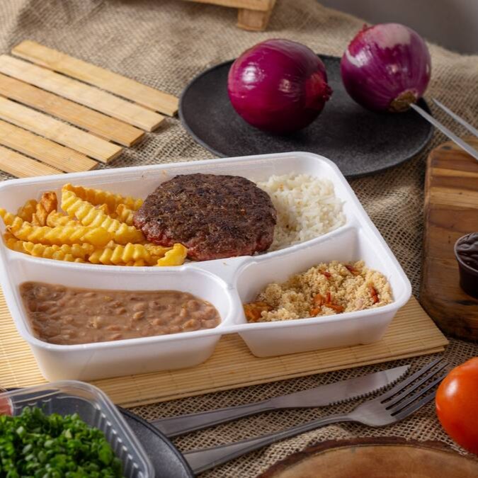 200g de carne - Experimente o nosso delicioso 'Hamburgão' da categoria 'Comidas do Dia a Dia' com generosas 750g. Este prato apresenta um substancioso hambúrguer de 200g, grelhado à perfeição, harmoniosamente acompanhado de um arroz soltinho, um feijão bem temperado, batatas fritas crocantes e uma farofa irresistível. Uma combinação rica em sabores que promete agradar ao paladar mais exigente. Um prato perfeito para quem aprecia a autêntica comida caseira!