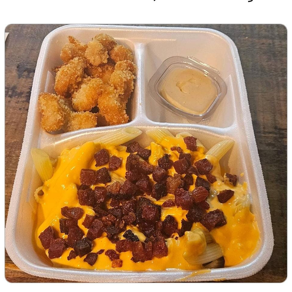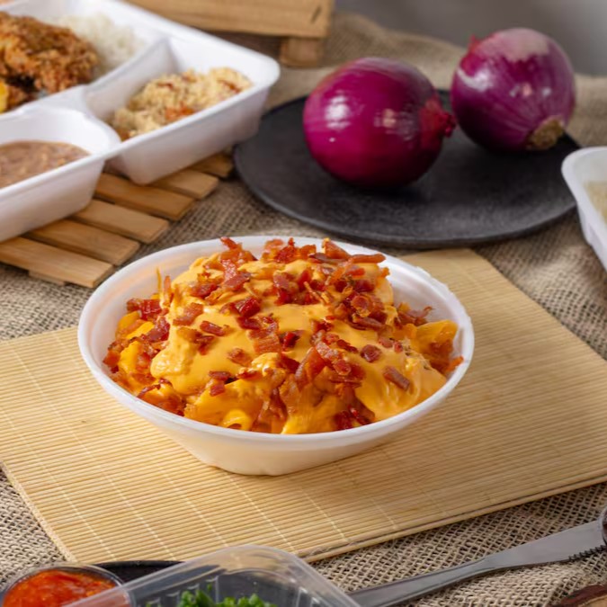 Macarrão com cheddar cremoso e bacon acompanhado de iscas de frango