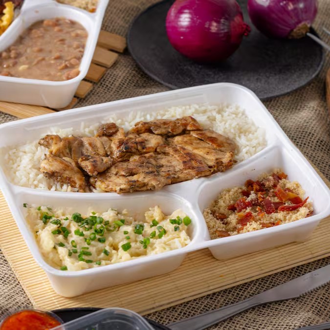 200g de carne - Delicie-se com nosso suculento Contra Filé, impecavelmente assado para alcançar o ponto perfeito de suavidade e sabor. Este prato é acompanhado de um arroz soltinho e aromático, uma maionese de batata cremosa e rica em sabor, preparada de forma artesanal, e uma farofa caseira, crocante e perfeitamente temperada. Cada porção é generosamente servida, tornando-se a escolha ideal para os verdadeiros amantes de churrasco. Um prato repleto de tradição e sabor inigualável.
