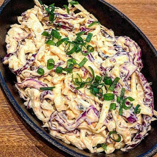 Repolho branco + repolho roxo acompanhado de maionese caseira e pedaços de manga