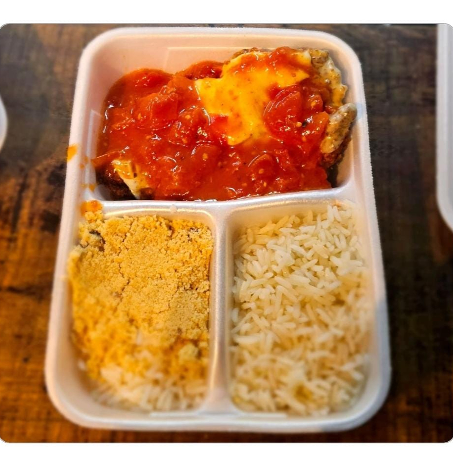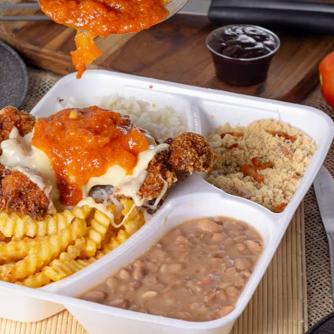 Arroz, farofa e parmegiana de coxa sobre coxa finalizada com Catupiry Original e queijo ao molho pomoro caseiro
