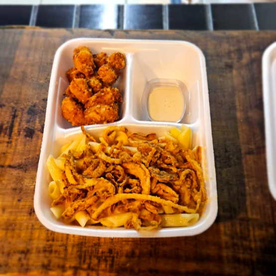 Macarrão com molho francês e cebola crispy acompanhado de isca de frang