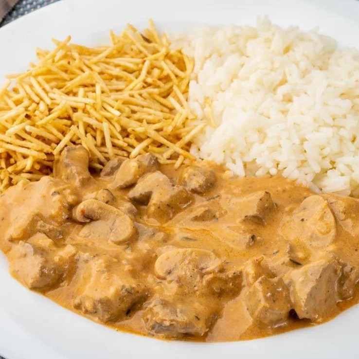 Prato contendo arroz 250g, batata palha 120g, tirinhas de bife bovino com molho de strogonoff 200g. #strogonoff #comida #comidabrasileira #entrega #gratis #promoção #strogonoff