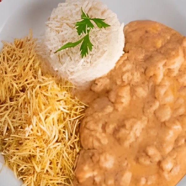 Prato contendo arroz 250g, batata palha 120g, tirinhas de file de frango com molho de strogonoff 200g. #strogonoff #comida #comidabrasileira #entrega #gratis #promoção #strogonoff