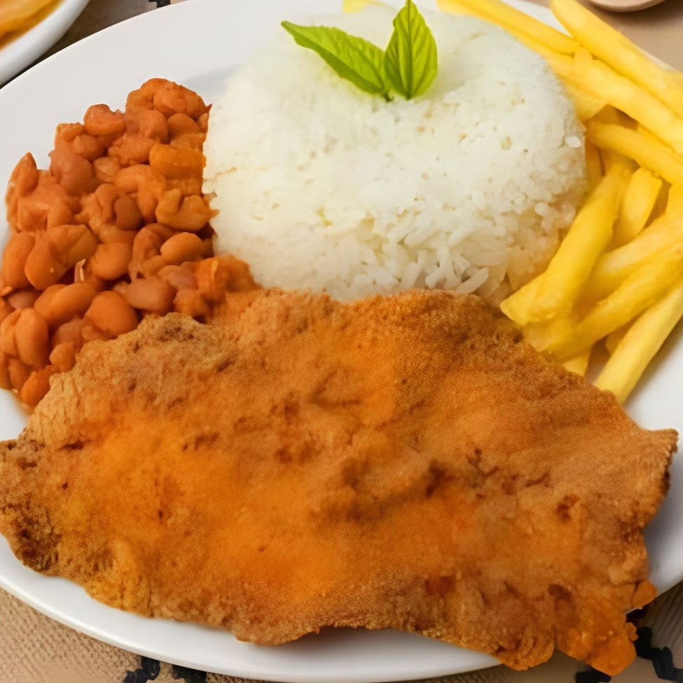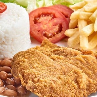 Prato contendo, arroz 250g, feijão 150g, filé de frango a milanesa 120g, batata frita palito 100g, salada de alface americana com tomate. #comida #brasileira #comidabrasileira #entrega #gratis #frango #milanesa #batatafrita