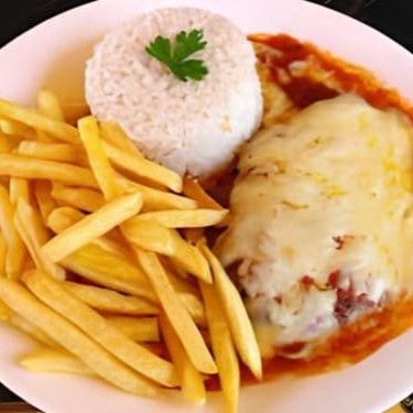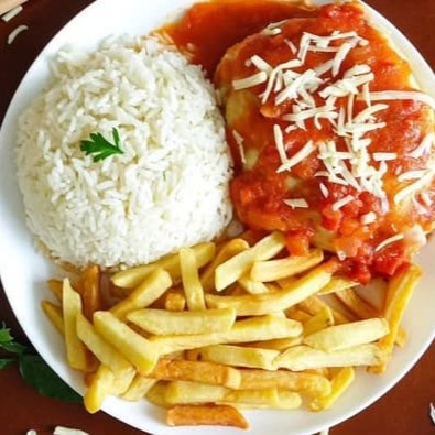Um delicioso prato contendo: Arroz 250g, batata palito 100g, bifé bovino 150g empanado com molho ao sugo artesanal com mussarela. #parmegiana #frango #comida #comidabrasileira #entrega #gratis #promoção