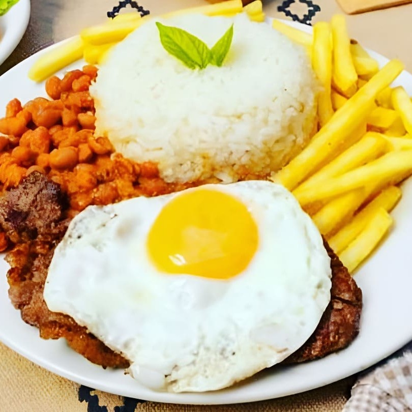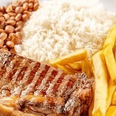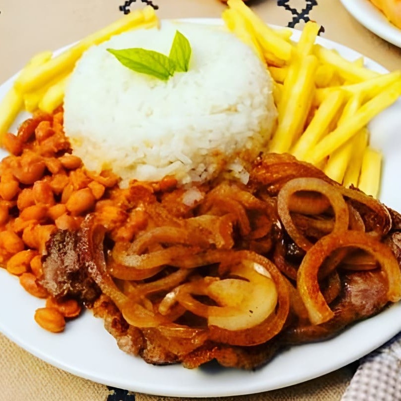 Prato contendo, arroz 250g, feijão 150g, bife acebolada 120g, ovo frito, batata frita palito 100g, salada de alface americana com tomate. #comida #brasileira #comidabrasileira #entrega #gratis #carne #batatafrita #bife