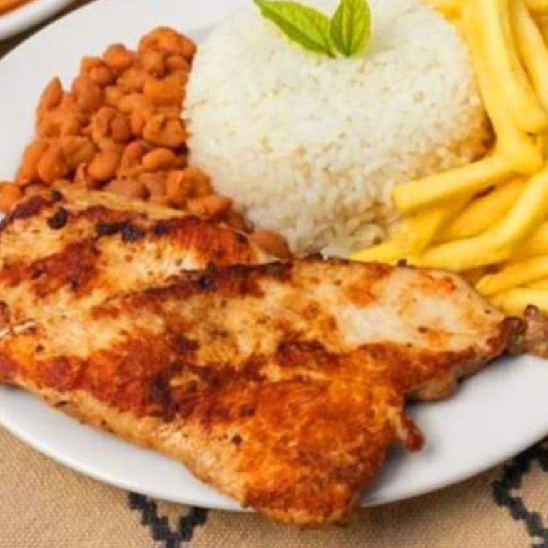 Prato contendo, arroz 250g, feijão 150g, filé de frango grelhado 120g, batata frita palito 100g, salada de alface americana com tomate. #comida #brasileira #comidabrasileira #entrega #gratis #batatafrita #frango #grelhado
