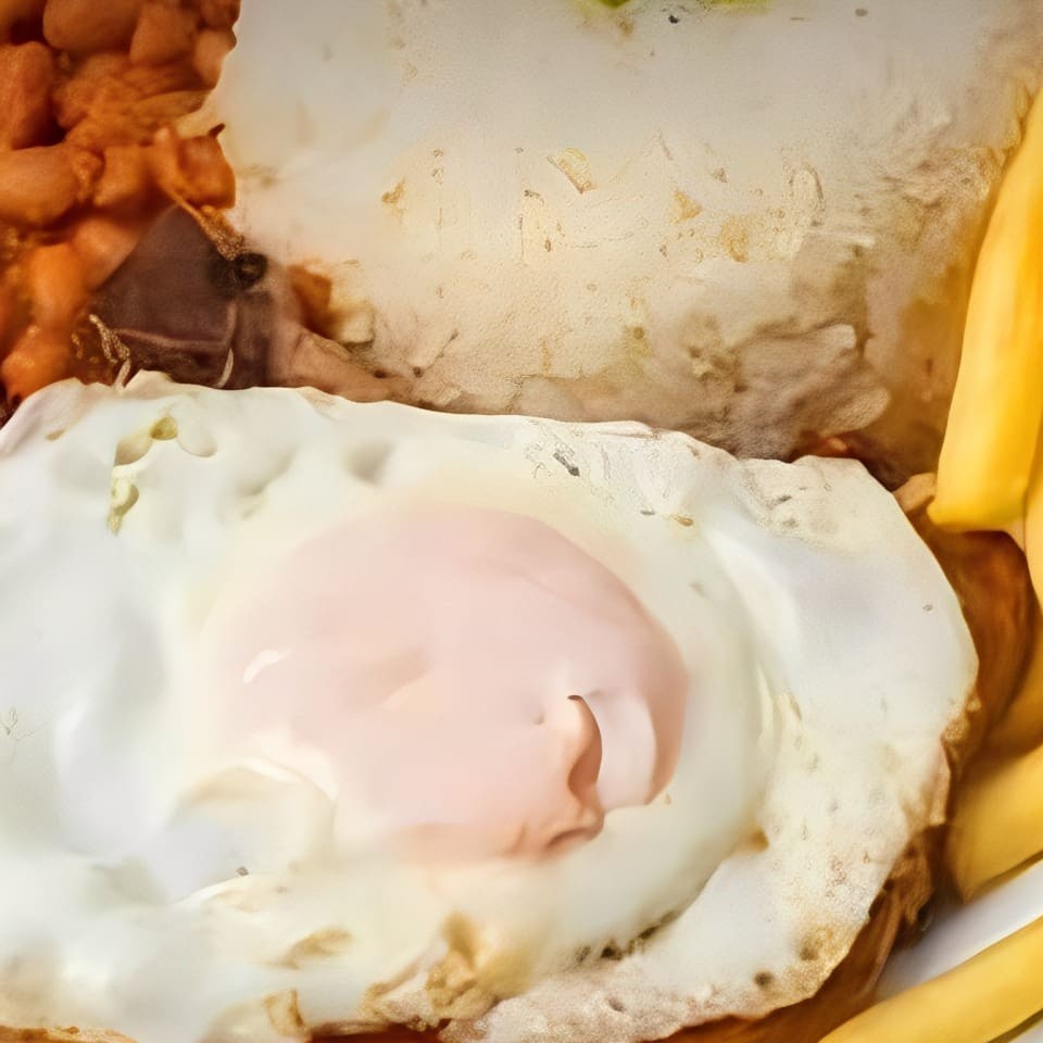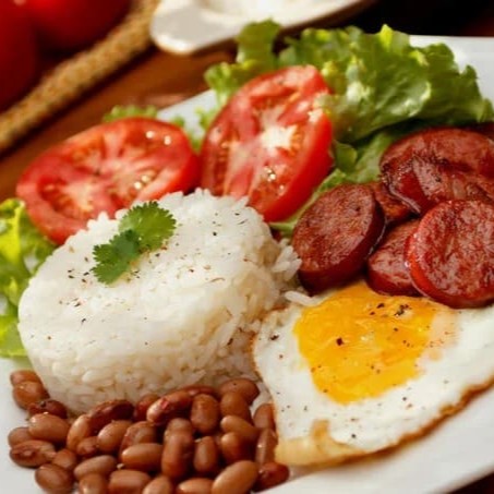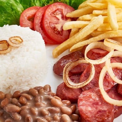 Prato contendo, arroz 250g, feijão 150g, Calabresa 120g com ovo frito, batata frita palito 100g, salada de alface americana com tomate. #comida #brasileira #comidabrasileira #entrega #gratis #bisteca #batatafrita