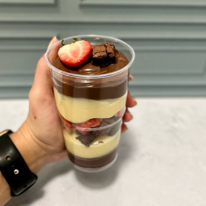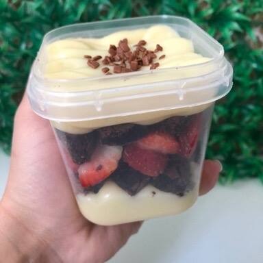 Nosso potinho que é sucesso na versão brigadeiro branco, com brownie e morango.