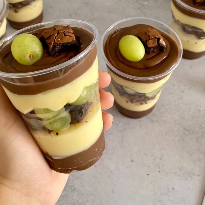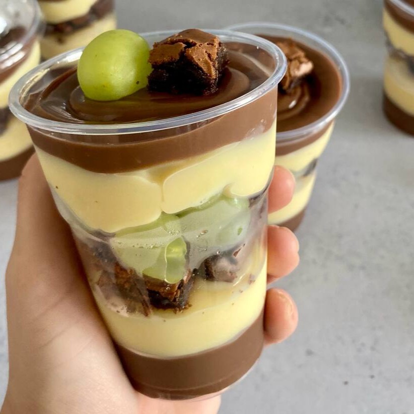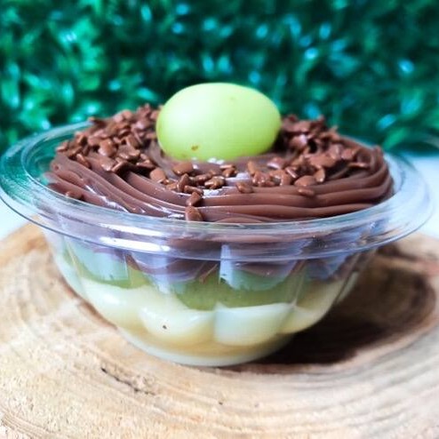Deliciosa combinação de uva sem semente, brigadeiro branco e finalizado com brigadeiro de chocolate cremoso.