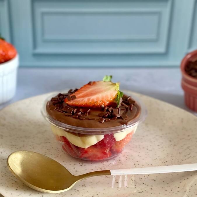 Deliciosa combinação de Brigadeiro branco cremoso, morangos frescos e brigadeiro de chocolate.