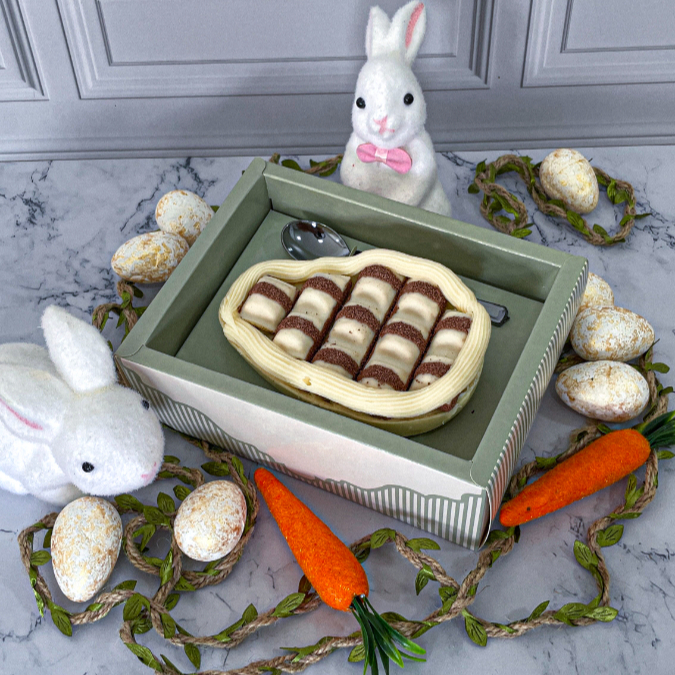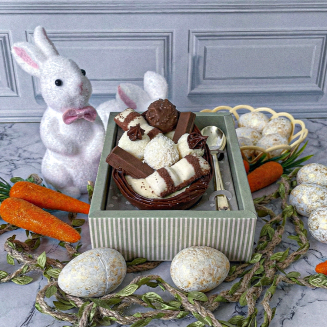 Ovo de Páscoa com Casca de chocolate ao leite, Brigadeiro de Ninho, Nutella, Ferrero, Raffaello, Kitkat, Kinder Bueno e brigadeiro de Ninho com Nutella. Acompanha caixa com display, colher na cor prata e laço de cetim.