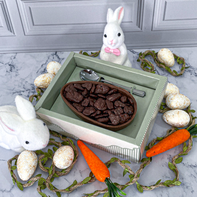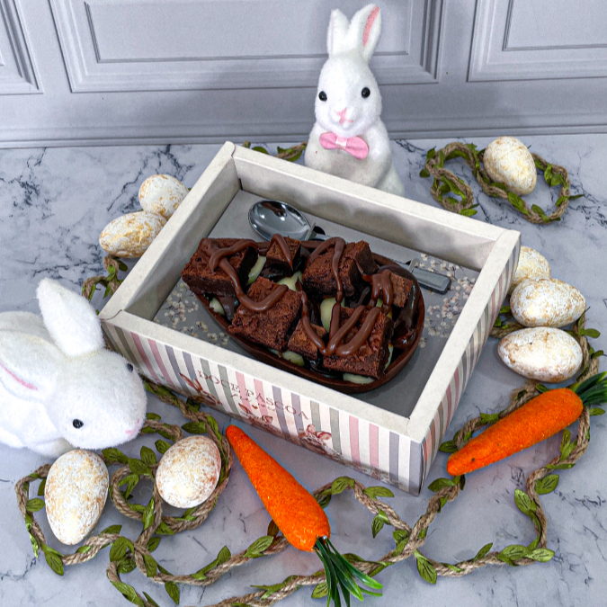 Ovo de Páscoa com Casca de chocolate ao leite, recheio de Brigadeiro tradicional, Brigadeiro de Ninho, pedaços de Brownie molhadinho e Nutella. Acompanha caixa com display, colher na cor prata e laço de cetim.