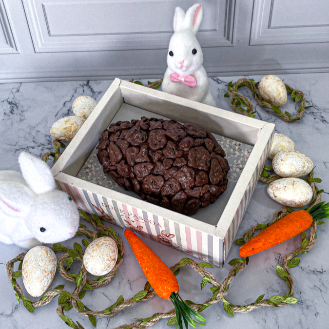 Ovo de Páscoa com Casca trufada, recheio de creme de Ovomaltine e cravejado com Rocks crocantes na decoração. Acompanha caixa com display e laço de cetim.