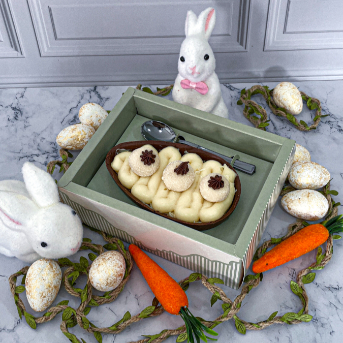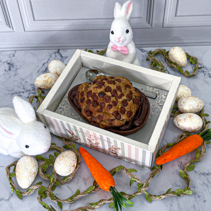 Ovo de Páscoa com Casca de chocolate ao leite, recheio de Brigadeiro cremoso e Cookie artesanal com Nutella. Acompanha caixa com display, colher na cor prata e laço de cetim.