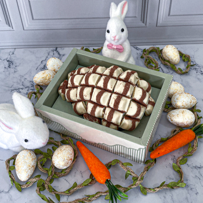 Ovo de Páscoa com Casca trufada, recheio de creme de Kinder Bueno, Brigadeiro de Ninho, Nutella e cravejado com Kinder Bueno. Acompanha caixa com display e laço de cetim.