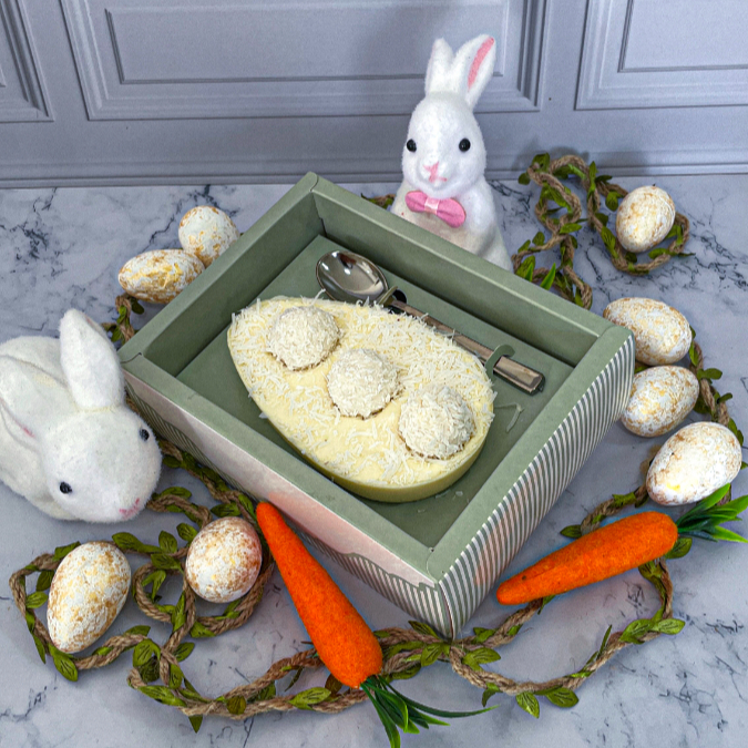 Ovo de Páscoa com Casca de chocolate ao leite, recheio de creme de Ninho, coco ralado em flocos e 3 bombons Raffaello. Acompanha caixa com display, colher na cor prata e laço de cetim.