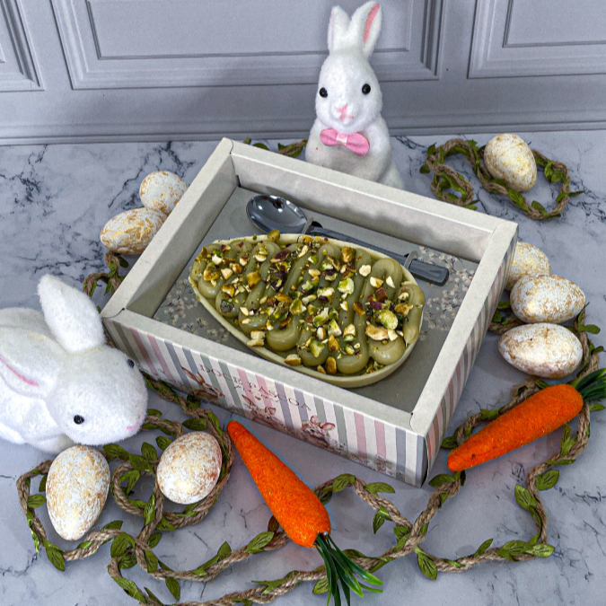 Ovo de Páscoa com Casca de chocolate ao leite, creme artesanal de pistache, brigadeiro de pistache e grãos de pistache. Acompanha caixa com display, colher na cor prata e laço de cetim.