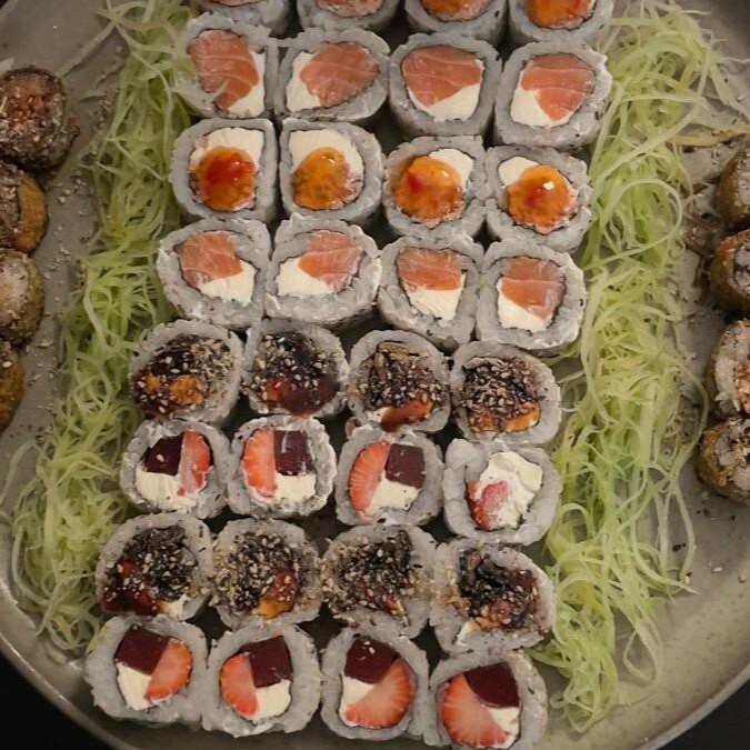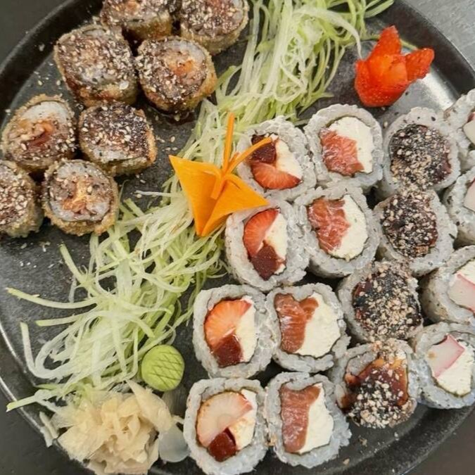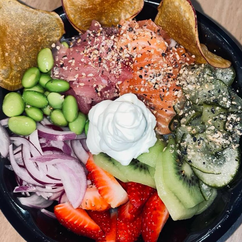 Salmão, atum, gohan, sunonomo, cebola roxa, kiwi, morango, edamame, chips de batata doce e cream cheese e molho da casa (tataki)