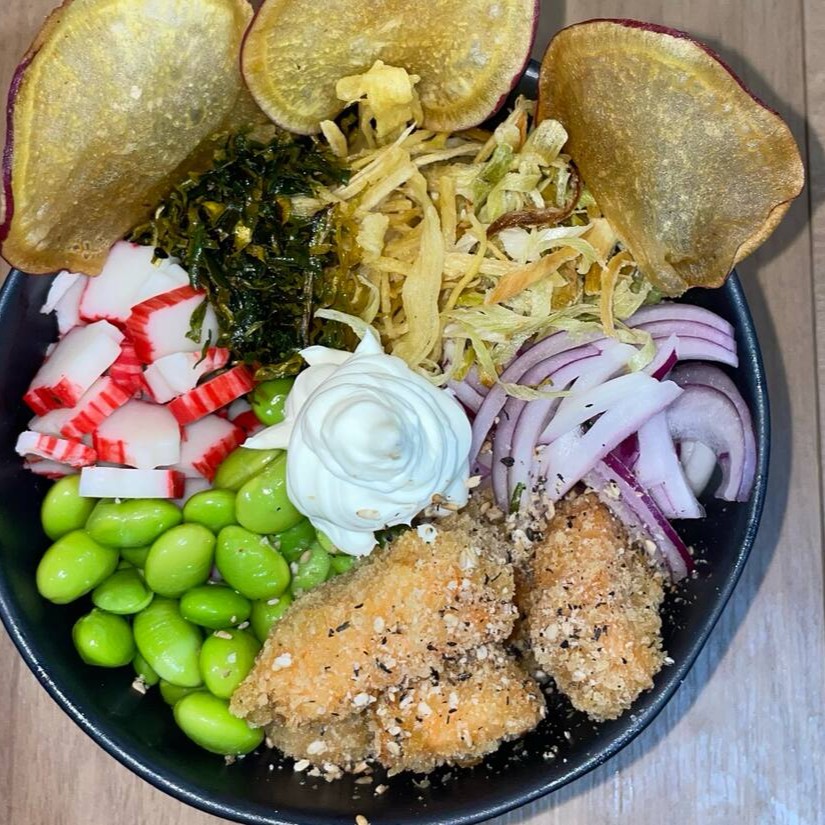 Gohan,salmão empanado,edamame,kanni, cebola roxa, couve crispy, poró,chips de batata e cream cheese.