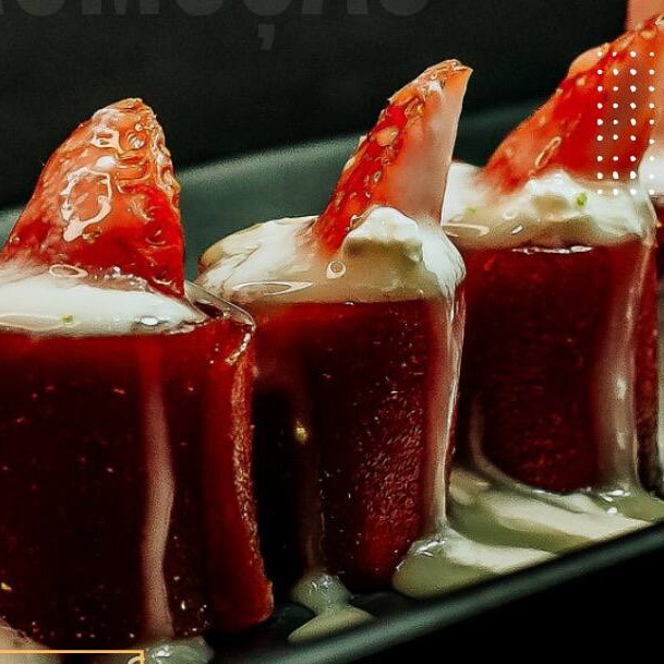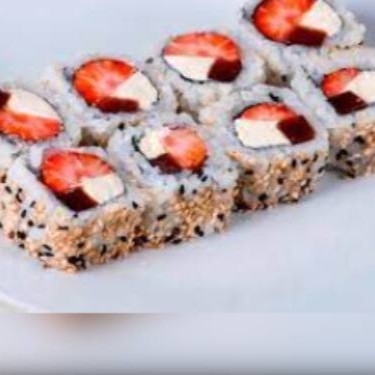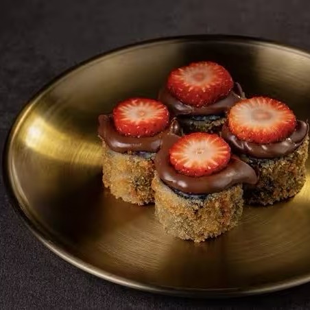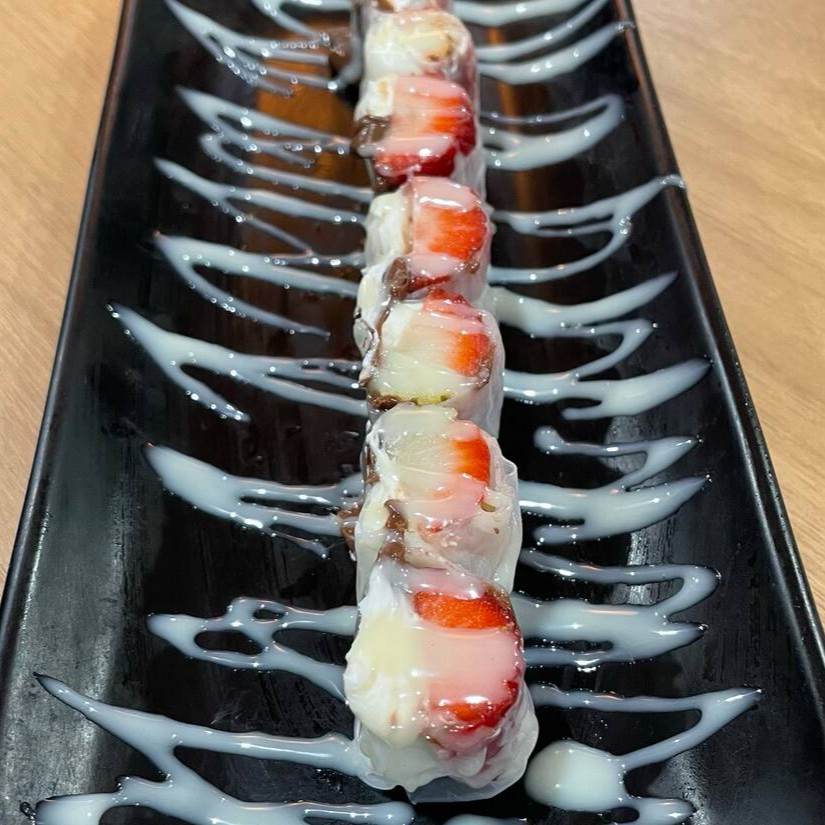 Morango, avelã, cream cheese, leite condensado envelopado na folha de arroz