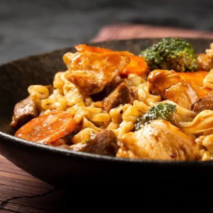 Carne, frango, macarrão e legumes.