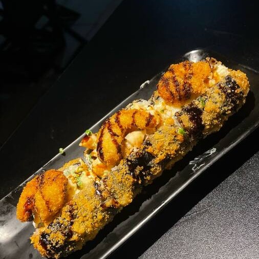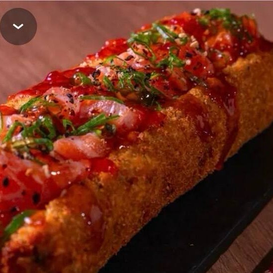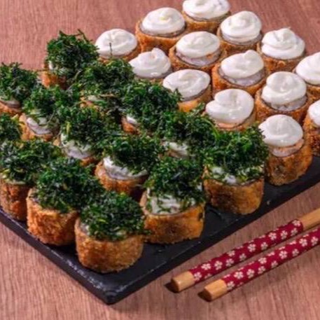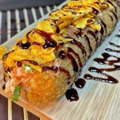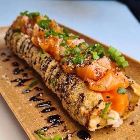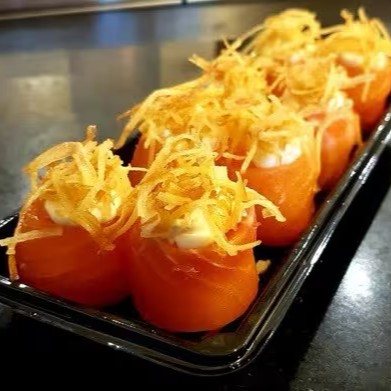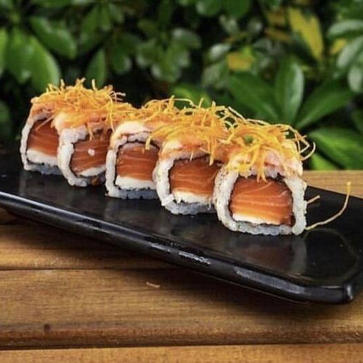 Arroz, salmão, cream cheese e molho sweet chilli.