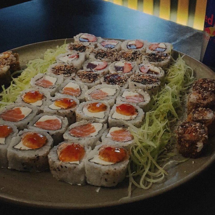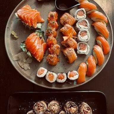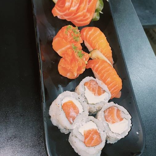 4un sashimi de salmão, 2un niguiri salmão, 2un joe de salmão, 4 uramalk Filadélfia e 8un hot Filadélfia