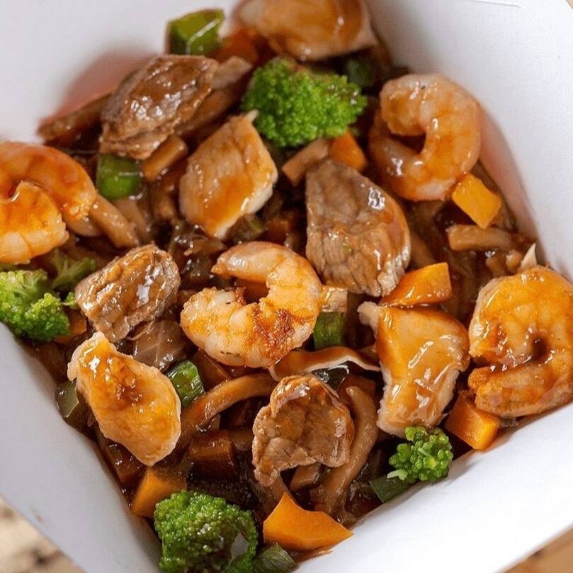 Camarão, carne, frango, macarrão cozido e legumes.