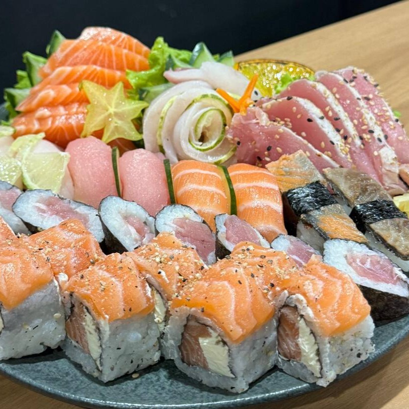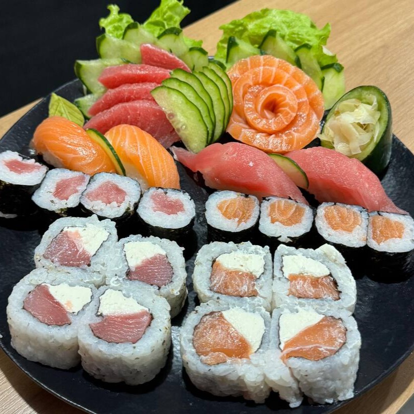 4un sashimi atum, 4un sashimi salmão, 2un niguiri atum, 2un salmão, 4un hossomaki atum, 4un hossomaki salmão, 4un uramaki salmão, 4un uramaki atum.