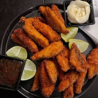 (300g) tiras de tilápia empanada na farinha panko, Acompanha limão, maionese e pimenta sweet.