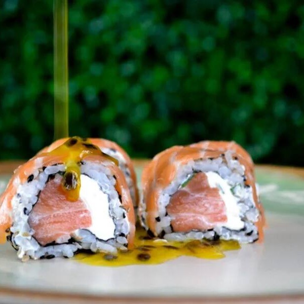 Arroz, salmão, cream cheese e maracujá.